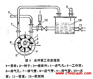 水環(huán)泵工作輪2在泵體1中旋轉(zhuǎn)時(shí)形成了水環(huán)3和工作室5,水環(huán)與工作輪構(gòu)成了月牙形空間。右邊半個(gè)月牙形的容積由小變大,形成吸氣室。左邊的半個(gè)月牙形的容積由大變小,構(gòu)成了壓縮過程(相當(dāng)于排氣室)。被抽氣體由進(jìn)氣管8和進(jìn)氣口4進(jìn)入吸氣室。轉(zhuǎn)子進(jìn)一步轉(zhuǎn)動(dòng),使氣體受壓縮,經(jīng)過排氣口6和排氣管7排出。排出的氣體和水滴由排氣管道7進(jìn)入水箱10,此時(shí)氣體由水中分離出來,氣體經(jīng)管管道9排到大氣中,水由水箱進(jìn)入泵中,或經(jīng)過管道11排到排水設(shè)備中。